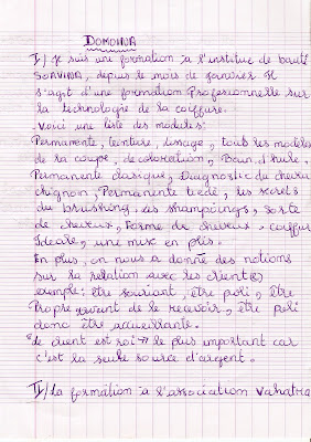 Voici le document, repris tel quel, écrit par notre grande Domoina qui souhaite devenir coiffeuse :