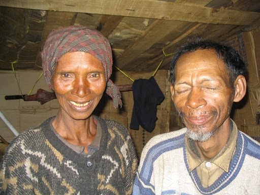 Je vais aussi vous parler de notre petit couple : le grand père aveugle et sa femme. Je n’ai pas de photo 2010 à vous montrer car il aurait été indécent de prendre des photos de notre petit papa squelettique, mourant au premier étage (où l’on accède par une échelle) de sa mini-maison à la campagne (à 4h de marche d’Antsirabe). Il ressemble à ces vieilles photos des hommes prisonniers des camps de concentration de la 2e guerre mondiale. Couché à même le sol, malade depuis le mois de février, il n’arrive pratiquement plus à s’alimenter. Sa petite femme, court partout et s’occupe de lui, heureusement qu’elle a un courage et un enthousiasme époustouflant, elle est son dernier petit rayon de soleil… Il a refusé que nous l’emmenions en voiture jusqu’à l’hôpital, il souhaite mourir chez lui… Bonjour tristesse.