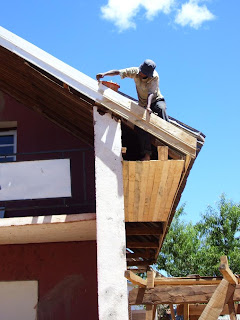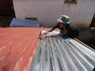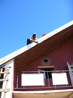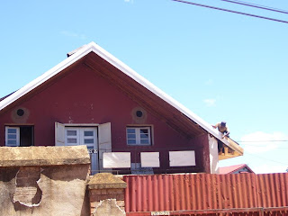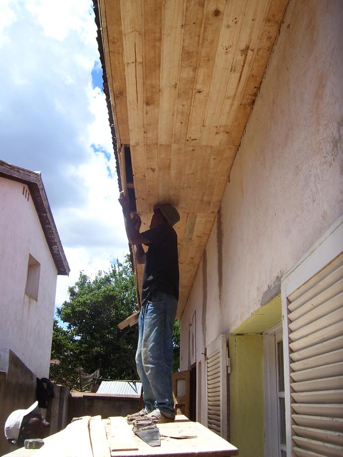 Pendant ce temps, et ce malgré les pluies et orages abondants, les travaux se poursuivent et avancent à Fahitana. Quelques photos des travaux du toit : remplacement des tôles, peintures, soubassement en bois…